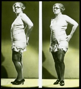 Today it is a great document of corset styles of the past and the changing social mores of the 1920s and 30s that enabled women to be photographed in this state of undress. In the collection there is both a black-and-white and a yellow tinted version of this slide. Perhaps the two different coloured slides were used in sequence to make a point of the different body shapes or 'figure flaws', incorrect postures or ill-fitting corsetry.