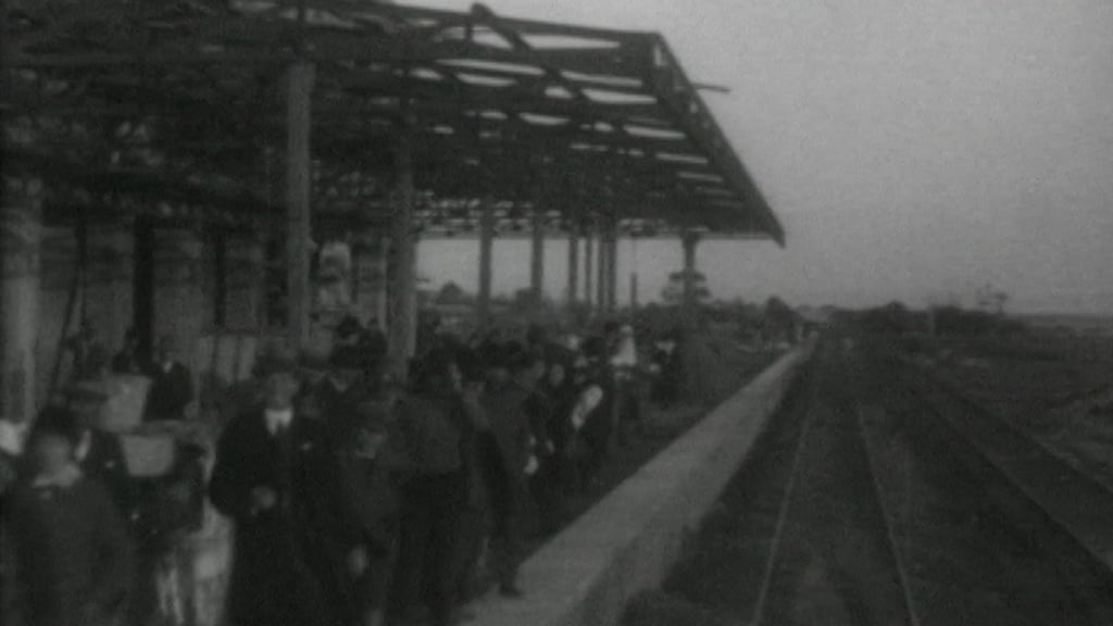 This silent black-and-white clip shows scenes from the construction of the Trans-Australian Railway between Port Augusta in South Australia and Kalgoorlie in Western Australia. The opening scene of men unloading timber sleepers is followed by scenes of two men in a buggy driving alongside the railway track, of a steam engine and of teams of men carrying heavy rails into position. A slow pan shows work on an elevated section of line and the clip concludes with a tracking shot of stockpiled sleepers.