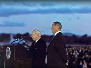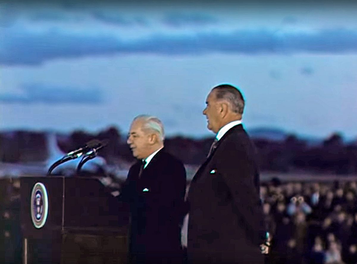 The Menzies government had introduced the National Service scheme in November 1964. Men of 20 years of age were selected by ballot, based on their birthday, to perform national military service. Those chosen were called up for two years’ continuous full-time service, followed by three years of part-time service. At the scheme’s introduction, the government aimed to form an army of 37,500 soldiers to support the US intervention in Vietnam. In August 1965 Menzies announced that the 1966 intake would be increased in order to form an army of 40,000. When Menzies retired in January that year, his successor Harold Holt, in his very first prime ministerial statement, announced a further expansion of Australia’s troop commitment, declaring that national service conscripts would be liable for combat duties in Vietnam. Holt’s personal friendship with US President Lyndon B Johnson added another dimension to Australia’s support for US military operations. On a visit to Washington in July 1966 and again when Johnson visited Australia in October the same year, Holt used the US Democratic Party’s campaign slogan ‘All the way with LBJ’ to publicly demonstrate his government’s willingness to back its ally.