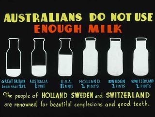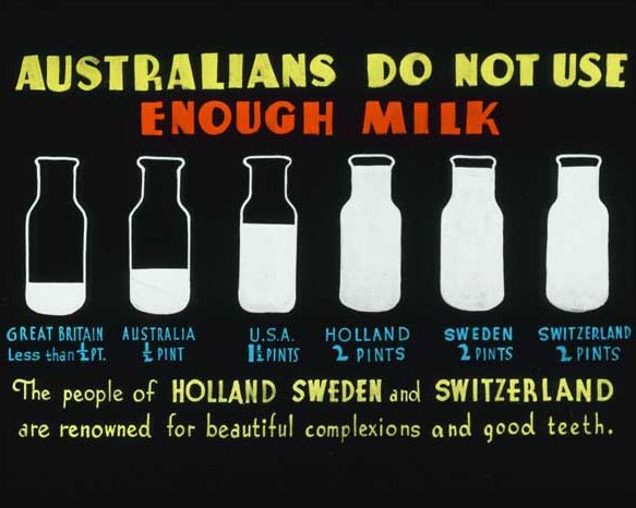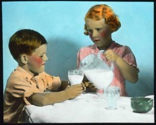 A young girl fills the cup of her smaller companion with milk with a somewhat deadly look in her eye. It is not known exactly what this hand-coloured glass slide would have been used for, but it is likely to be either part of the educational slides used to train Berlei fitters, or part of the Berlei presentation Beauty and the Balance.