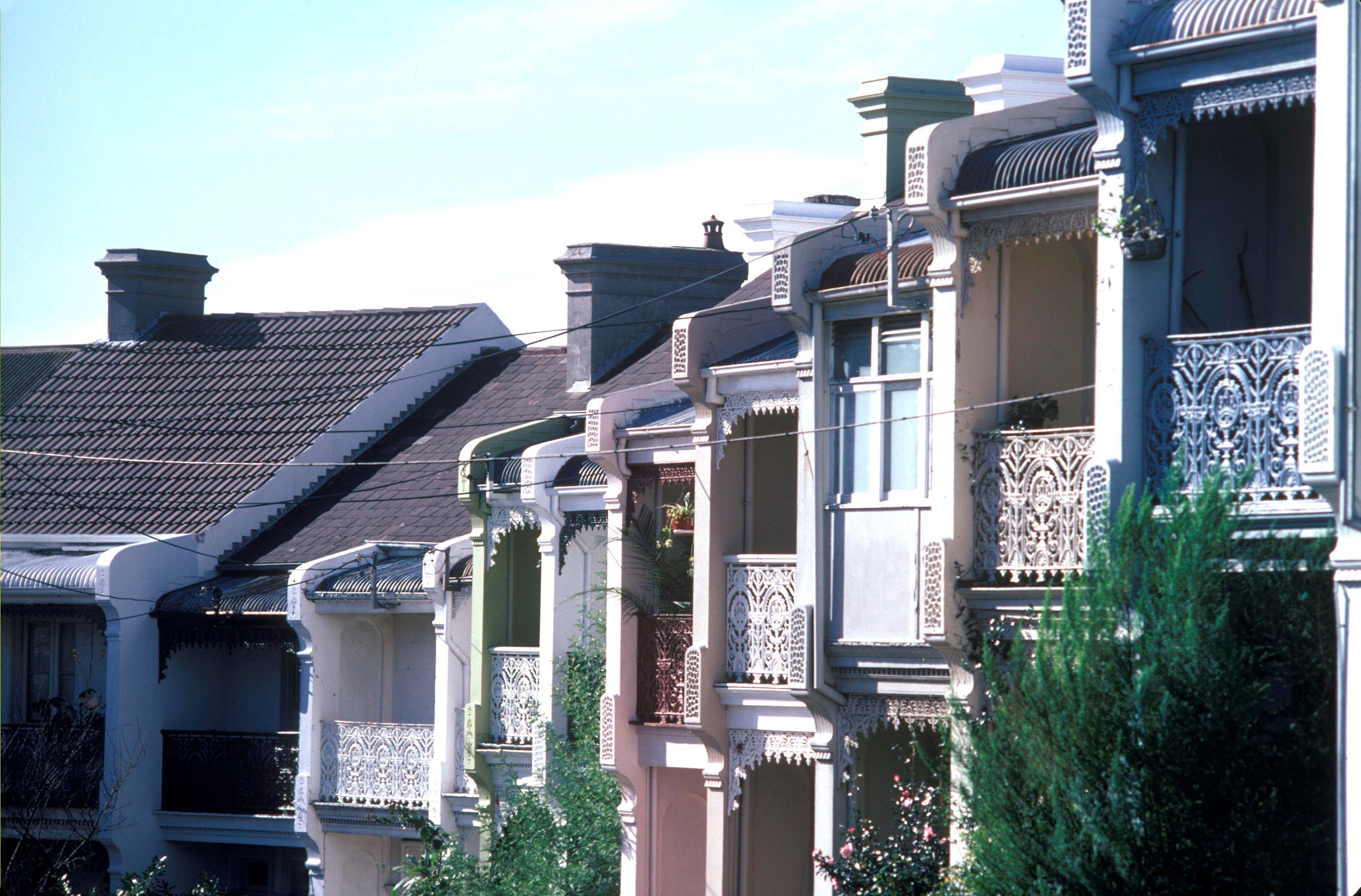 A row of houses in Sydney, all displaying balconies made of ironwork.