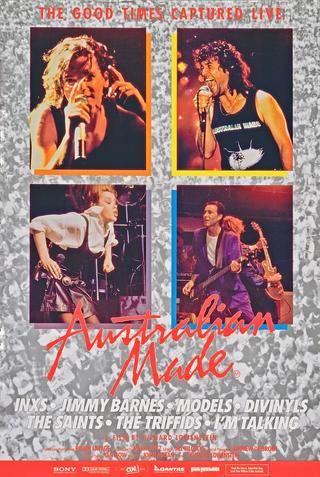 Promotional poster for Australian Made: The Movie (1987), a music documentary directed by Richard Lowenstein. This live concert film is from the Australian Made tour featuring Jimmy Barnes, INXS, Divinyls, Models, The Triffids, The Saints, I'm Talking and Mental As Anything that happened over the summer of 1986 and 87.