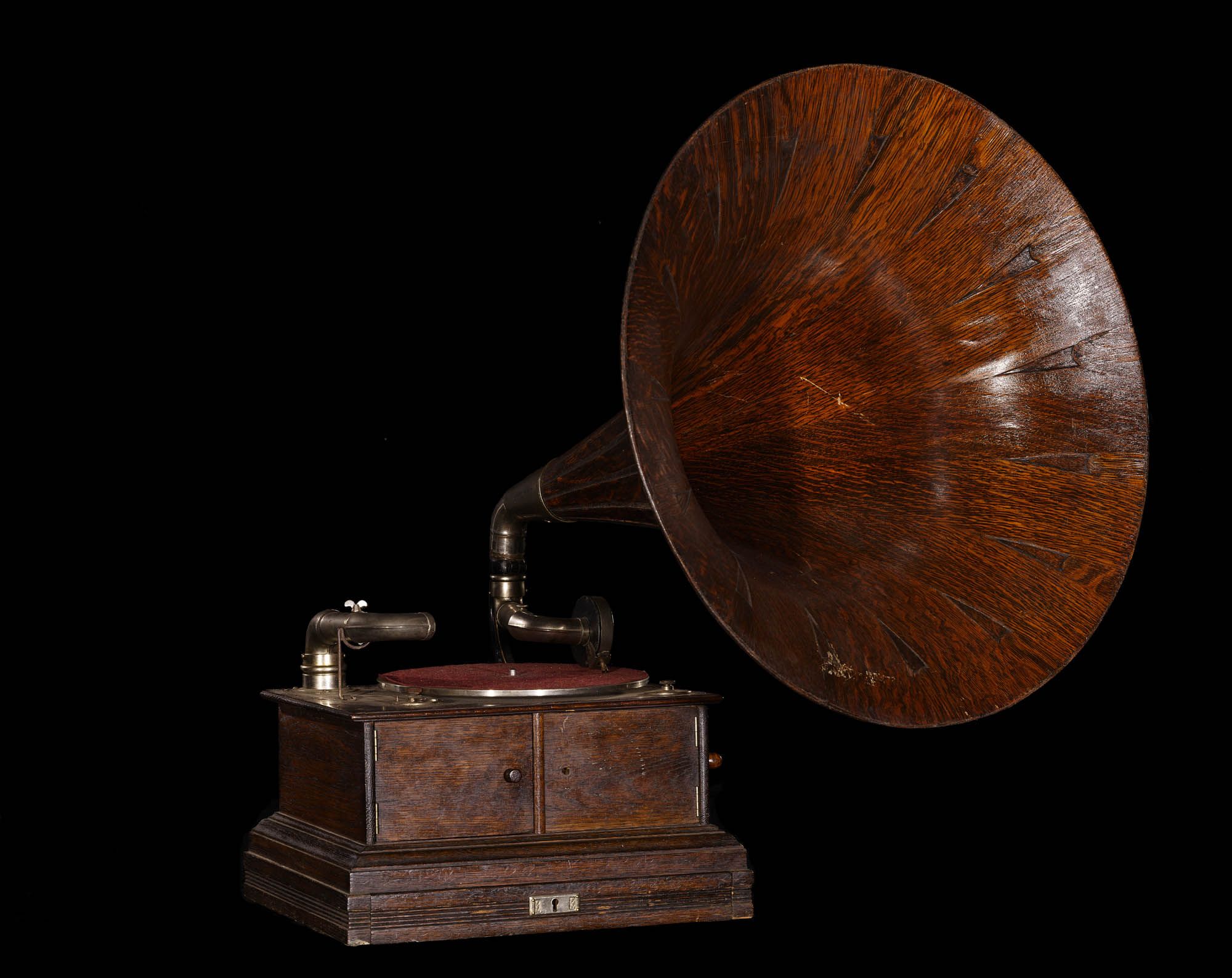 Known as a talking machine, gramophones playing flat discs, or records, gradually replaced Edison’s cylinders as the preferred format for playing music in the home. This spring-operated Beltona model from 1908 could produce sound using its internal speakers or with an external horn.