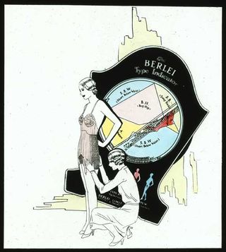 This illustration of the Berlei Type Indicator would have been used either as part of the Berlei training for prospective corsetieres, or as part of one of their women-only live shows or film screenings in the late 1930s and early 40s. It shows a corsetiere examining the fit of a foundation garment with the indicator appearing in the background.
