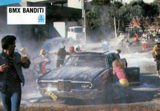 This is one of a set of four lobby cards printed for the Yugoslavian release of the Brian Trenchard-Smith film BMX Bandits (1983).