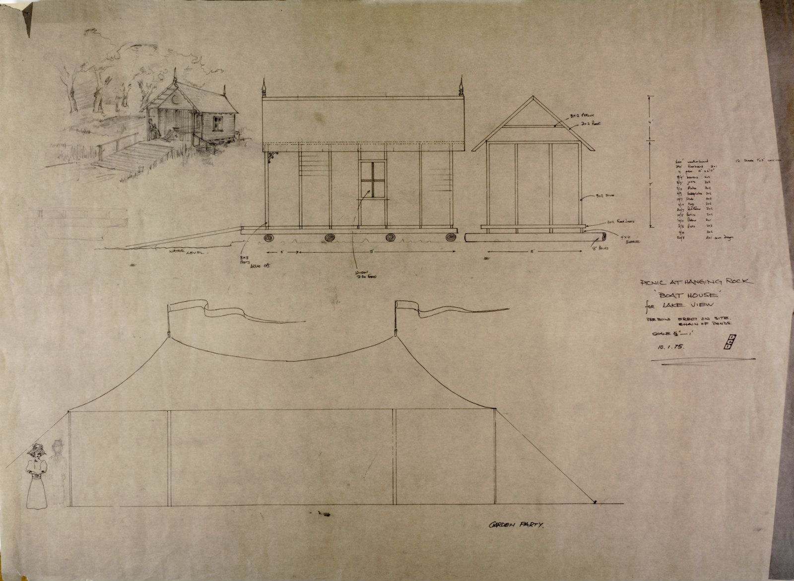 Architectural sketch for Lake View boathouse and garden party marquee.