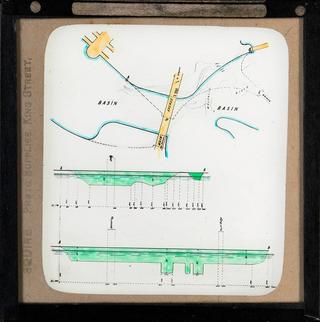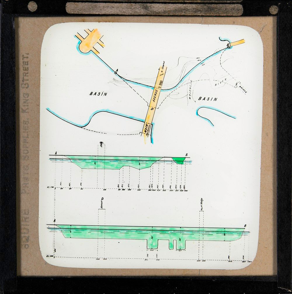 This slide shows a plan and two section drawings of the main avenue bridge crossing over the Central and Western Basins and the depth of lake under the bridge. This bridge is now known as the Commonwealth Avenue Bridge.
