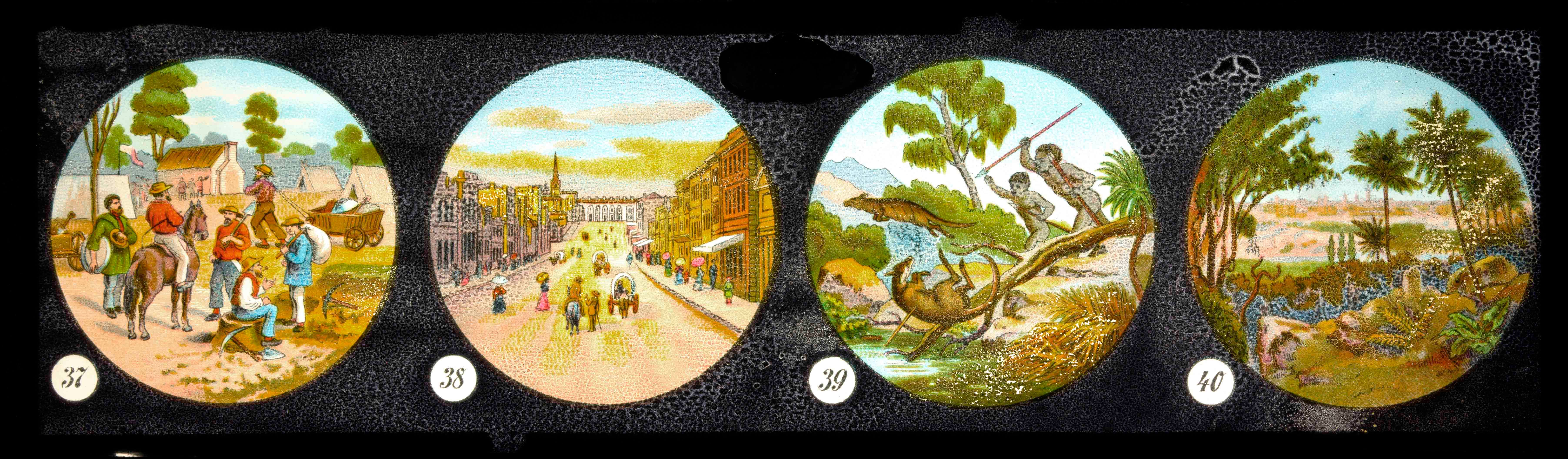 Sophia says it is significant that the slide contains the juxtaposition of native people, landscapes and animals with the growing city of Melbourne – ‘the unknown being written over with the familiar’. As Sophia points out, this artefact is incomplete because we do not know what would have been said in the accompanying lecture. The popular narrative at the time was of European civilisation ‘conquering the savages’, so it is likely that this sentiment was part of the message.
