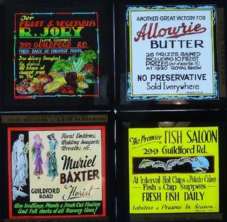 Four colourful cinema advertising glass slides from businesses on Guilford Road, Sydney.