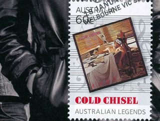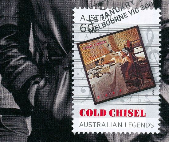 In 2013 it was the Australian music industry's turn to receive the honour, with Australia Post issuing a series of stamps titled Australian Legends of Music. Pictured here is the cover of a postage stamps booklet featuring Cold Chisel, who were one of the recipients, along with other music industry heavyweights including INXS, AC/DC, Paul Kelly, Kylie Minogue, The Seekers, Men At Work, John Farnham, Olivia Newton-John and Ian 'Molly' Meldrum.