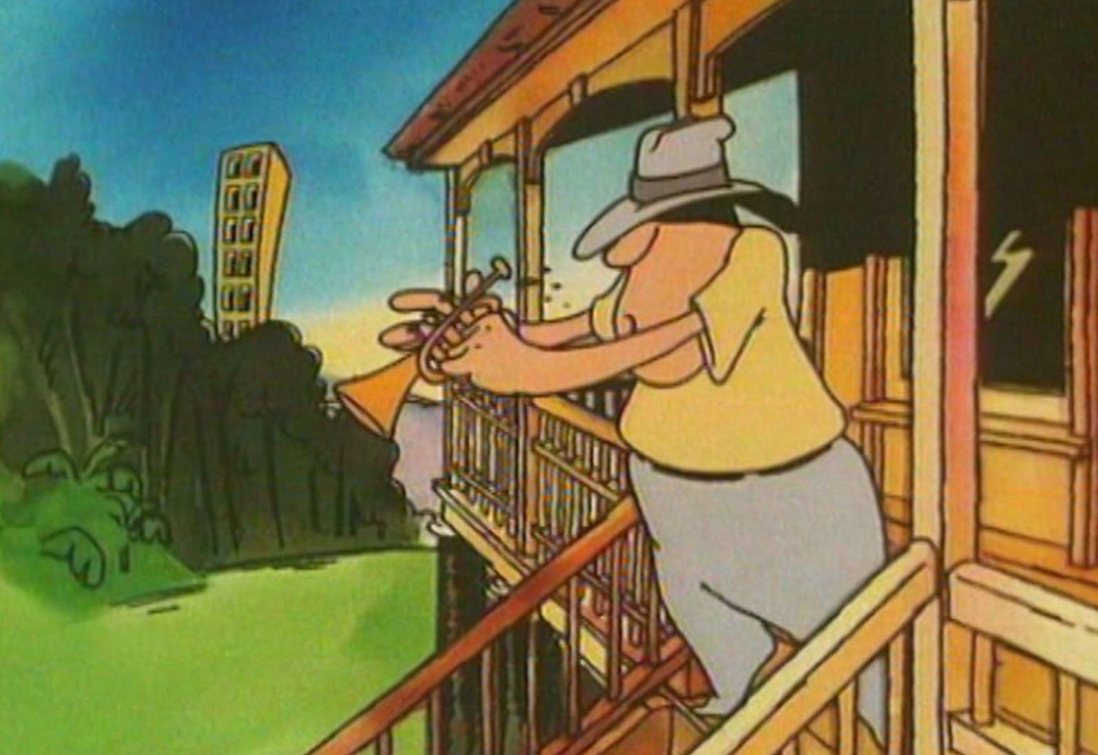 The protagonists of this surreal drama are seated at the kitchen table arguing over a broken biscuit. Evenrude (voiced by Bruce Currie) resembles a medieval knight with a propeller head, the other figure (voiced by John E Hughes AKA Hobart Hughes) has a head that is a cross between a football and an African sculpture. Each figure sees a fish – supposedly the protagonists’ dinner – circling in space. Inside the biscuit, a hardworking ant works for a 'crust’ to feed his family.