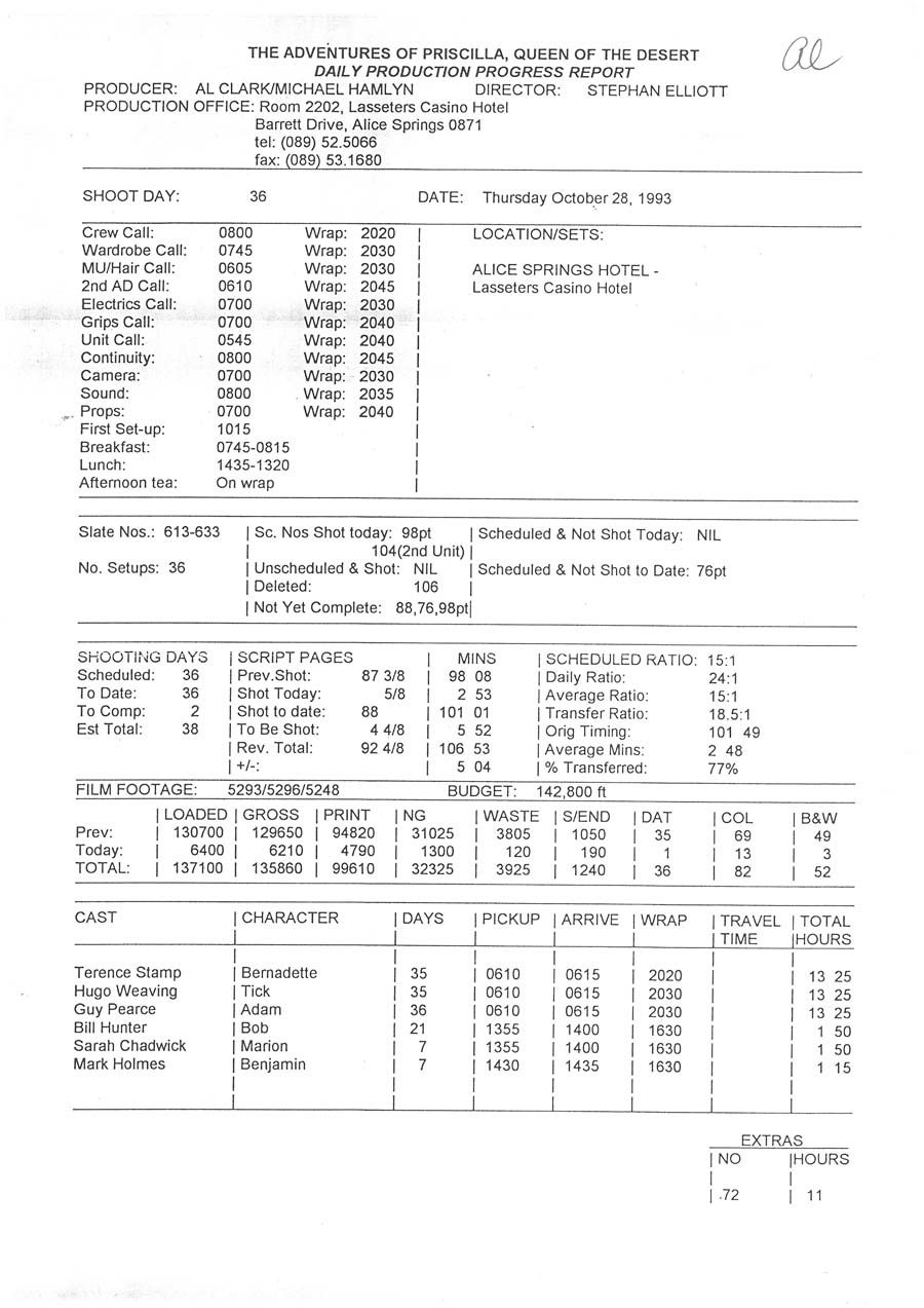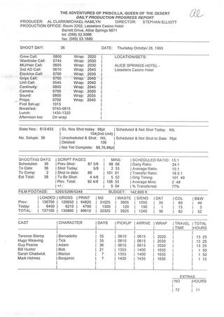 Daily reports outlining the number of shots and scenes completed, amount of film stock used, the timing of the days activities, and any scheduled scenes that were not completed.