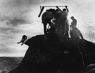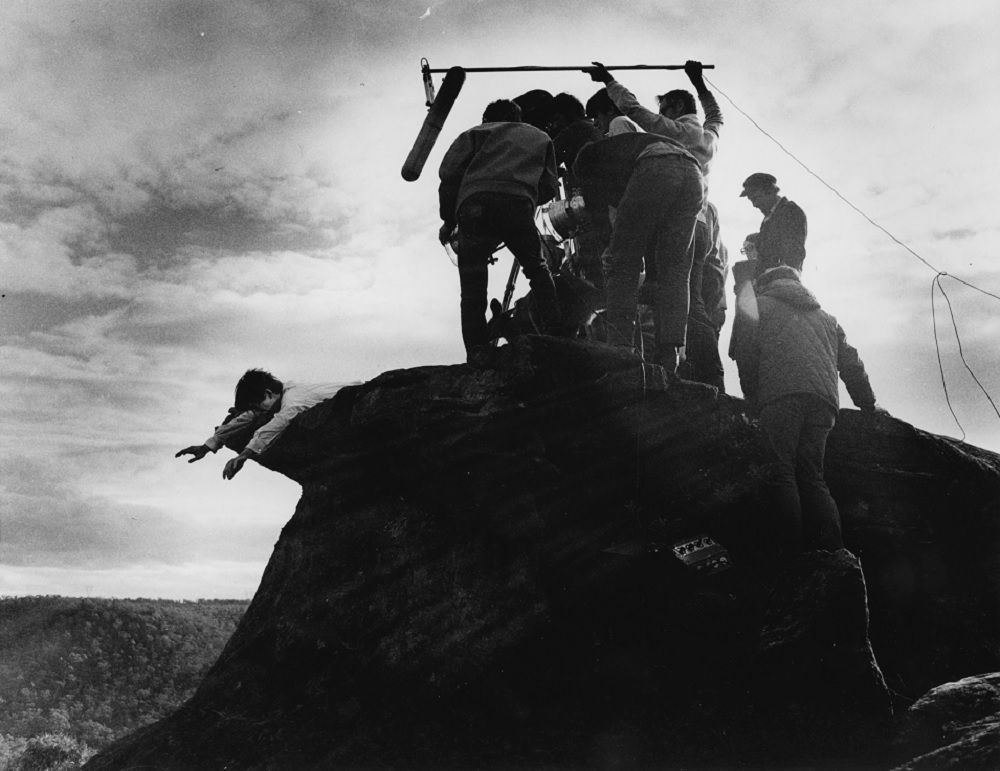 David Downer being filmed on the Skippy set hanging over a cliff for the episode, Follow My Leader.