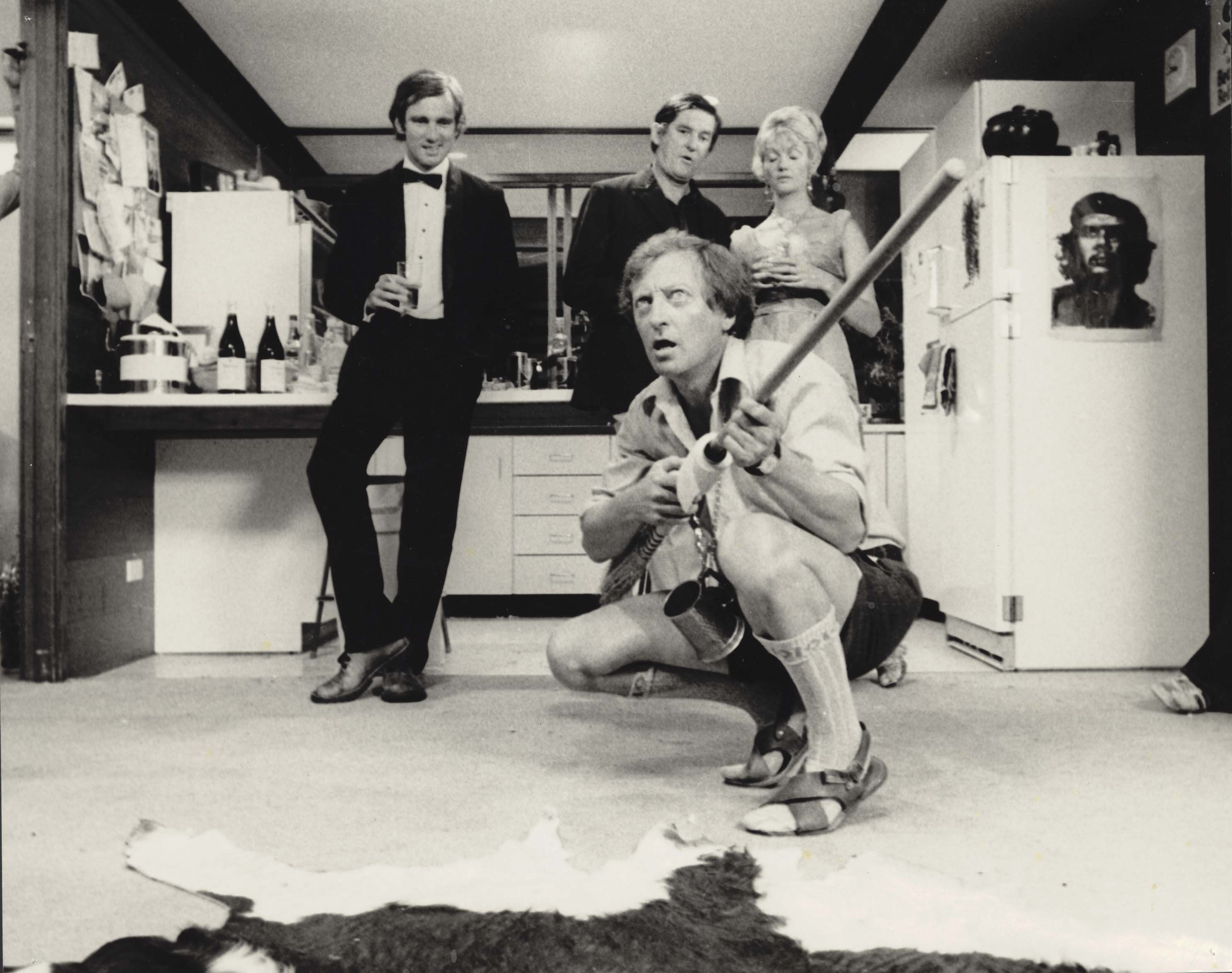 Still image from Don's Party showing Mack (Graham Kennedy) crouching with broomstick. Don (John Hargreaves), Mal (Ray Barrett) and Jody (Veronica Lang) stand in the background.