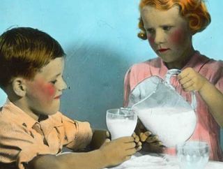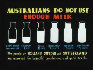 The text says: 'Australians do not use enough milk. Great Britain less than 1/2 pint. Australia 1/2 pint. USA 1 1/2 pints. Holland 2 pints. Sweden 2 pints. Switzerland 2 pints. The people of Holland, Sweden and Switzerland are renowned for beautiful complexions and good teeth'.