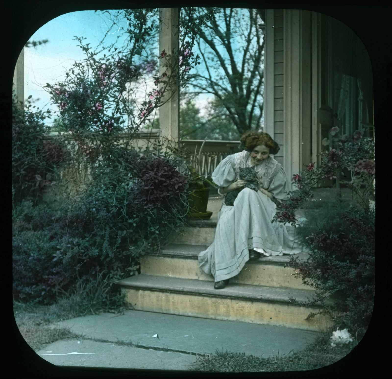 One of a set of hand-painted cinema slides for the song ‘Eileen My Own’, a hit song from 1906, showing 'Eileen' playing with her cat.