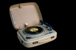 Self-contained light blue record player with bright blue plastic tone arm and speed selector, and a blue slip mat. Plinth is mounted in a blue and white vinyl suitcase. The player was connected to a radio set which provided the amplifier and speaker.