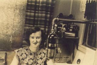 1950s female radio announcement Enid Hoggan in 2CK Auditorium, January 1950.