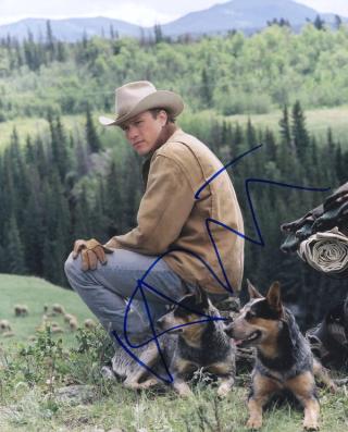 This signed publicity portrait of Heath Ledger as Ennis Del Mar was created to promote the film Brokeback Mountain (2005). Ledger looks every bit the part of an American sheep herder in the 1960s, wearing a cowboy hat and denim jeans, with his dogs and knapsack nearby. His pained expression here echoes the emotionally tortured situation Ennis finds himself in - in love with his best friend Jack, but unwilling to start a life with him for fear of violence and being separated from his children.