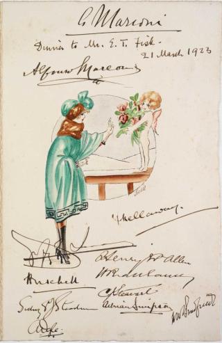 This menu, from a commemorative dinner attended by both men, was autographed by Marconi and remained one of Fisk’s most treasured personal possessions.