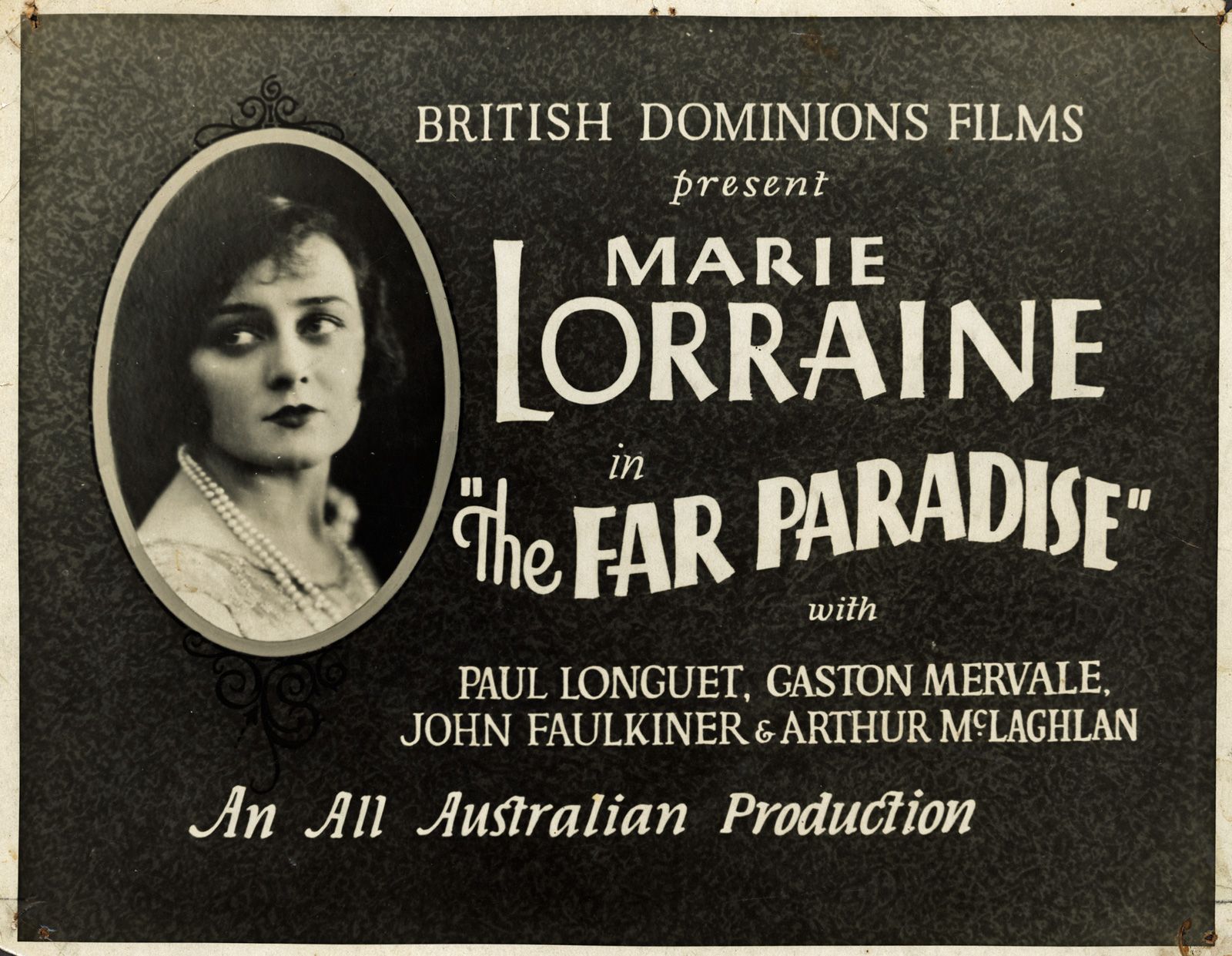 A cinema lobby card for the McDonagh sisters' 1928 silent film The Far Paradise.