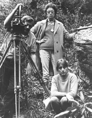 Director Marion Ord (crouching), 'continuity girl' Betty Barnett (standing) and camera operator Bob Feeney filming Valley of the Sentinels in Newnes, NSW, 1971.