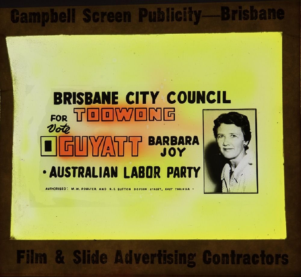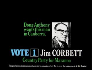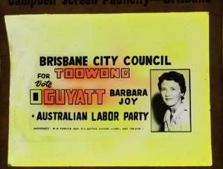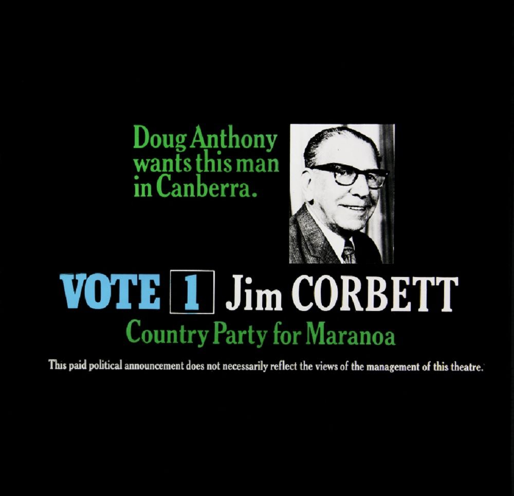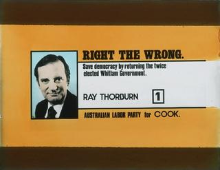 Glass slide. Orange and white background with colour portrait of Ray Thorburn. Full caption reads: ''Right the wrong. Save democracy by returning the twice elected Whitlam Government' Ray Thorburn 1 Australian Labor Party for Cook'.