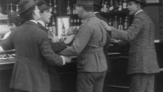 The traces of all these political currents are still visible in the footage we have. The anti-sport idea explains the first scene, in which Will Brown puts away his cricket bat and puts on his uniform. The scene in the bar deals with a pacifist as a low and cowardly type. Will’s sweetheart accepts his ring, and promises to wait for his return, giving women a clear depiction of their duty to their own menfolk. Beyond these sometimes crude attempts at war mongering, the film remains valuable for its images of a real army camp and real soldiers, in training at Liverpool. There is a great irony in this, because the re-created landing sequences were being used as actuality within a decade of the film being made. People took them as actual depictions of the landings, rather than re-creation. The actual scenes are the ones of the army camp and soldiers in real training – learning how to shoot, dig trenches and march in time. We even get a good sighting of the rudimentary mess facilities at the time. This is documentary footage, in fact, rather than fiction. The brief scenes at the end, of Australian troops in Egypt, were taken from a series of Pathe newsreels.