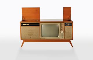 Luxury three-in-one showcase home entertainment unit featuring a 21-inch black-and-white television receiver, AM radio, record player, clock and a microphone.