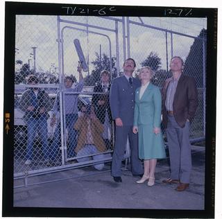 Gerard Maguire (Jim Fletcher), Patsy King (Erica Davidson), George Mallaby (Paul Reid) shooting a scene at the Wentworth Detention Centre gate.