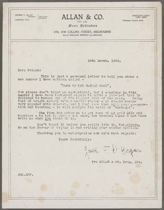 In this letter dated 10 March 1924, O'Hagan draws the reader’s attention to his newest song, 'Down By the Garden Gate'. Shortly after this, O’Hagan was engaged by the Auditorium to perform the hit.