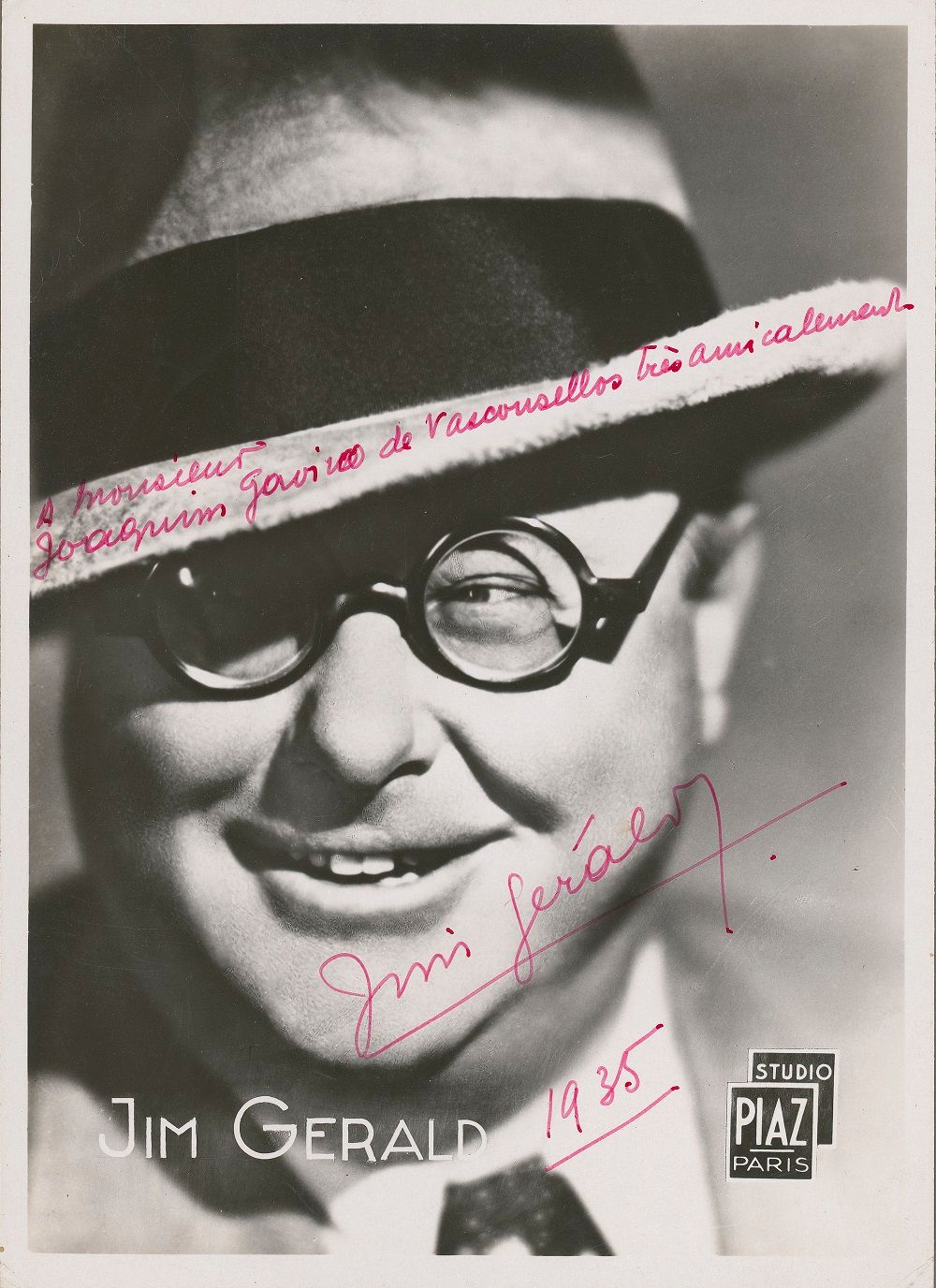 Close up head shot of Jim Gerald in a hat with glasses looking to his left. Jim Gerald in white writing and Studio Piaz, Paris logo at bottom of image. Across the brim of the hat, is a french sentence which may translate to 'To Sir, Joaquin Havier Vascousello?, very friendly?' , in red ink and Jim's signature, 1935 underlined, under his face.