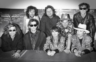 Group shot of the lead singers from all the main acts featured in the Australian Made concerts and music documentary held in December 1986 to January 1987. INXS and Jimmy Barnes were the headline acts for the concert series.