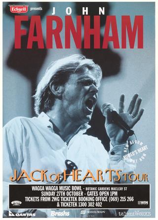 John Farnham's 1996 'Jack of Hearts' tour kicked off in Toowoomba in October, following the June release of the album Romeo's Heart. The tour saw John and his band travel to a number of outback towns along the way, treating the locals to some live music that they would not often get the opportunity to experience.