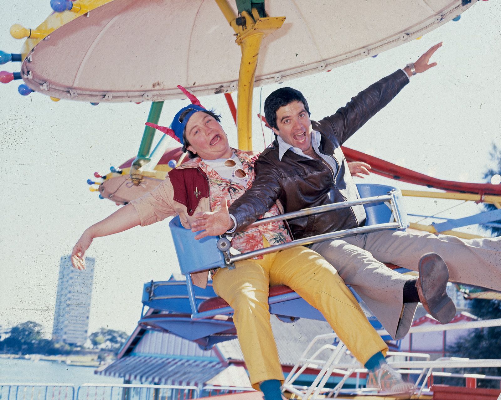 Wonder World! reporter Jonathan Coleman and Simon Townsend pictured on one of the rides at Luna Park in Sydney, circa 1981.