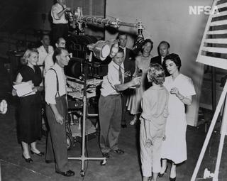 Artransa cast and crew shooting a television commercial, including left to right: Kay Roberts, Alex Ezzard (director), Bren Brown (camera), George Lowe (with light meter), Harry Griffith (agent). Circa mid to late 1950s.