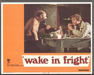 Doc Tydon (played by Donald Pleasence, left) and John Grant (Gary Bond) seated at a table in Doc's hut. An Australian lobby card to promote the release of Wake in Fright in 1971.