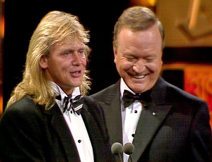 Do you remember the words to TV network idents, or ever feel the urge to get up and dance to the ABC news theme? You’re apparently not alone. To break up all the award-giving, the 1987 Logie Award producers asked musical theatre star Michael Cormack to sing a medley of TV station themes, backed by the Jillian Fitzgerald Dancers. The result is pure kitschy ‘80s bliss, with era-defining big hair, blinding white outfits and a bevy of dancers with rolled-up sleeves and ruffled skirts giving it all they’ve got, even if what they’re performing doesn’t make a lot of sense.