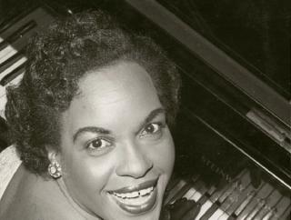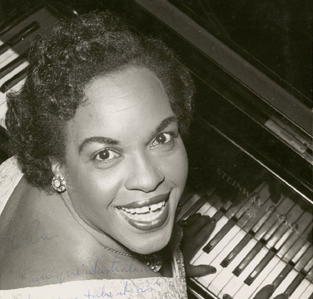 Louis Armstrong arriving at Sydney Airport to a welcome from the Sydney Jazz Club, 1956. There is a crowd of people holding a large banner of welcome while they watch Armstrong play.