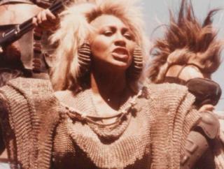 Group shot of cast and crew on the set of Mad Max Beyond Thunderdome, including Tina Turner in costume as Aunty Entity and co-directors George Miller and George Ogilvie.