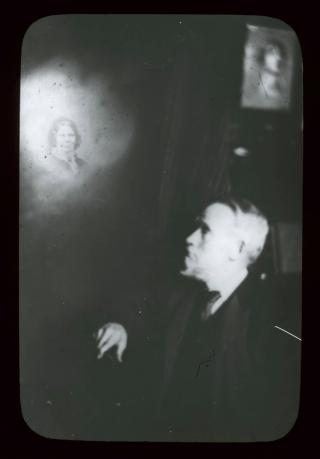 In this glass slide, a man looks up to his right at an illuminated spirit.