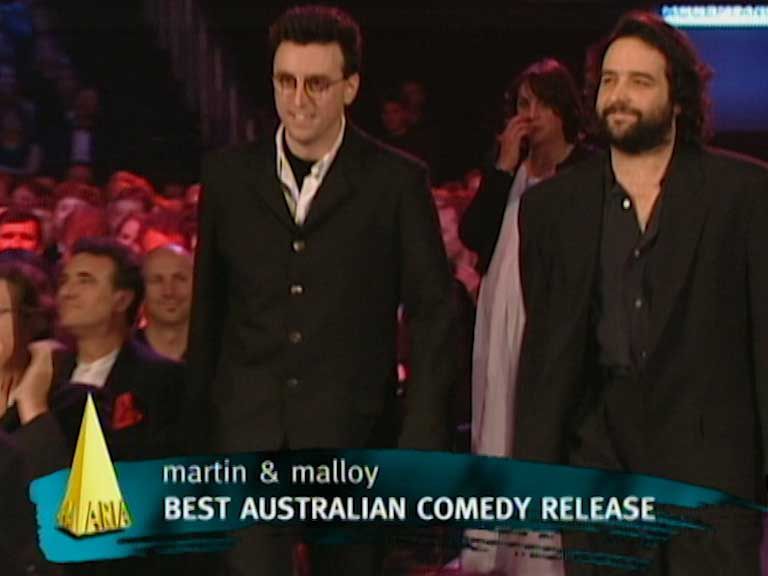 In this excerpt from the 1997 ARIA Awards, Tony Martin and Mick Molloy accept their second ARIA award for Best Comedy Release for their compilation album Poop Chute.