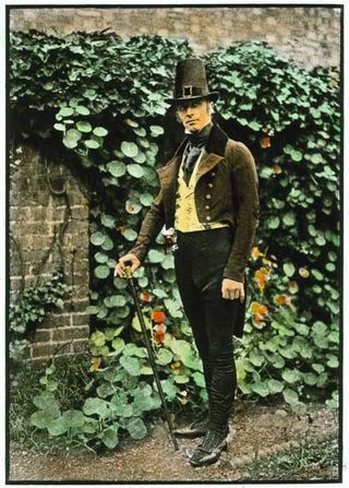 This hand-coloured glass slide shows a male model in a brown hat, jacket and cane with yellow waistcoat standing before a garden wall.