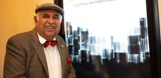 Australian photojournalist Mervyn Bishop at the opening of the exhibition Mervyn Bishop: Australian Photojournalist in 2021.