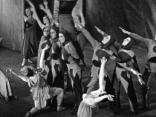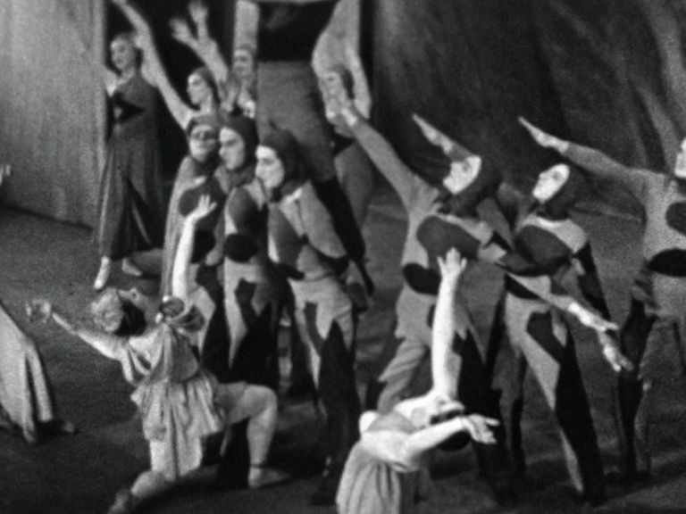 With exotic, lush designs and costuming this colour sequence brings to life the Ballets Russes performances in a way that black-and-white film does not. Shot from a higher, sharper angle to the stage by Murray-Will, this clip is still vivid in its detail.