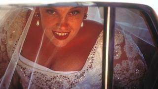 Muriel (Toni Collette) smiling and peering out of the car window as she arrives at the church for her wedding.