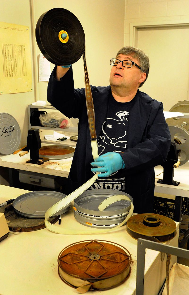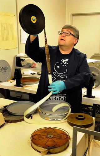 Nitrate Vault Leader, George Willeman, inspecting a reel of nitrate film. A badly decomposed reel can be seen on the table in the foreground.