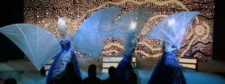 Screenshot from The Adventures of Priscilla, Queen of the Desert. Hugo Weaving, Guy Pearce and Terence Stamp perform on stage in a series of dazzling costumes, the most elaborate of which replicates the silhouette of Sydney's famous Opera House.