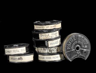 These eight black cannisters held 9.5mm film, the world's first successful home movie format on safety stock. Introduced in 1922, the Pathé Baby camera and projector used 9.5mm film with sprocket holes between the frames and down the centre of the film stock. The set allowed projection of popular titles or home movies made by keen amateurs using unexposed film. The system proved popular and led to an increase in amateur filmmaking and clubs before the Second World War, after which 8mm emerged as the dominant home movie format.