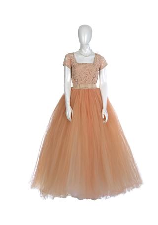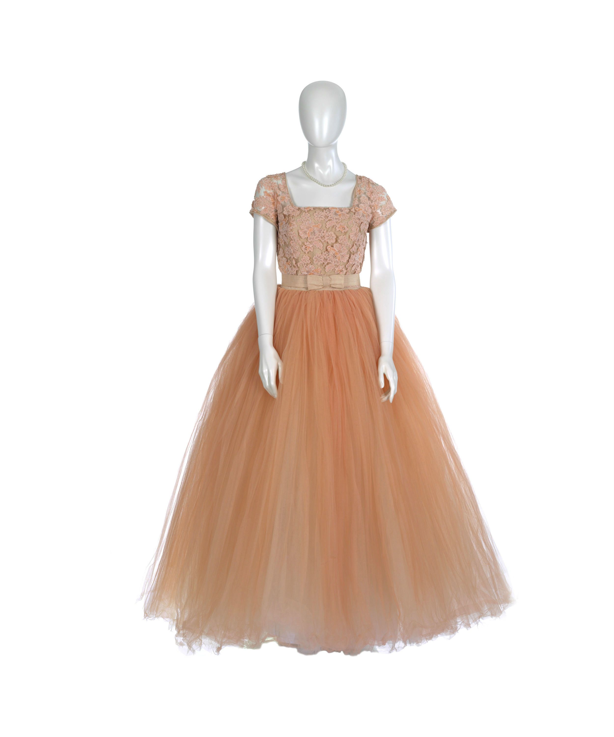 Each ensemble comprises a peach-coloured, floor-length frock with tulle skirt and lace bodice. Also part of the costume are a white petticoat, floral hairpiece, earrings and gold shoes.